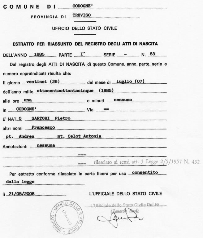A Certidao de Nascimento foi emitida em 21/05/2008. Esta Certidao foi utilizada em 2009 pelo Angelo para as seguintes retificaçoes: Certidao de Casamento de Pietro Francesco Sartori e Elisa Girardi, Certidao de Obito de Pietro Francesco Sartori, Certidao de Nascimento do seu pai Antonio Sartori, Certidao de Casamento dos seus pais Antonio Sartori e Yolanda Marques dos Santos, Certidao de Obtido do seu pai Antonio Sartori, a sua Certidao de Nascimento e por fim, o mais esperado a sua Cidadanina Italiana ao Angelo J M Sartori em 16/05/2019 na Comuni de Cocciano na Italia.