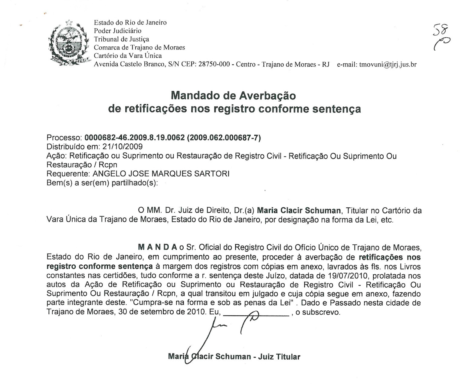 Esta foi o 1° Processo de Retificaçoes solicitado pelo Angelo Sartori através do seu advogado Dr; Ernani que ocorreu em 3o de setembro de 2010 na Comarca de Trajano de Moraes:Certidao de Casamento de Pietro Francesco Sartori e Elisa Girardi, Certidao de Obito de Pietro Francesco Sartori, Certidao de Nascimento do seu pai Antonio Sartori, Certidao de Casamento dos seus pais Antonio Sartori e Yolanda Marques dos Santos, Certidao de Obtido do seu pai Antonio Sartori, a sua Certidao de Nascimento.